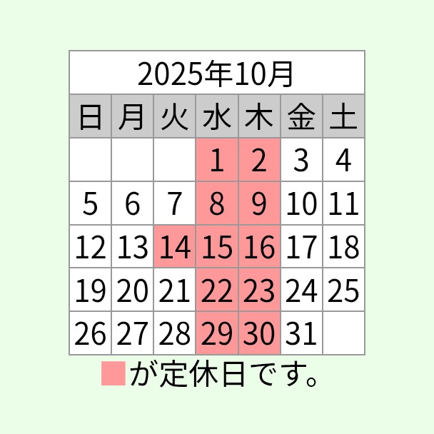 1㈬、2㈭、8㈬、9㈭、14㈫、15㈬、16㈭、22㈬、23㈭、29㈬、30㈭